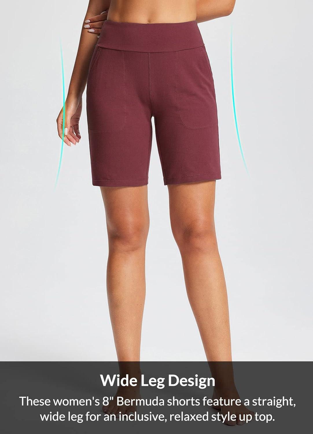baleaf 8" Bermuda Long Shorts for Women Cotton Athletic Sweat Tummy Control Casual Lounge Summer(Wine)