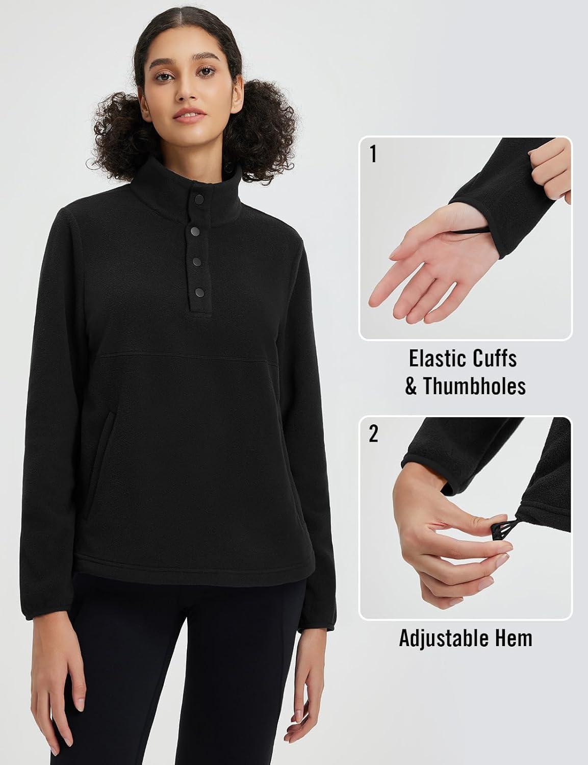 baleaf Women's 1/4 Buttom Down Fleece Pullover Thermal Long Sleeve Shirts Ski Mid Layer with Pockets Thumbhole Warm Tops(Black)