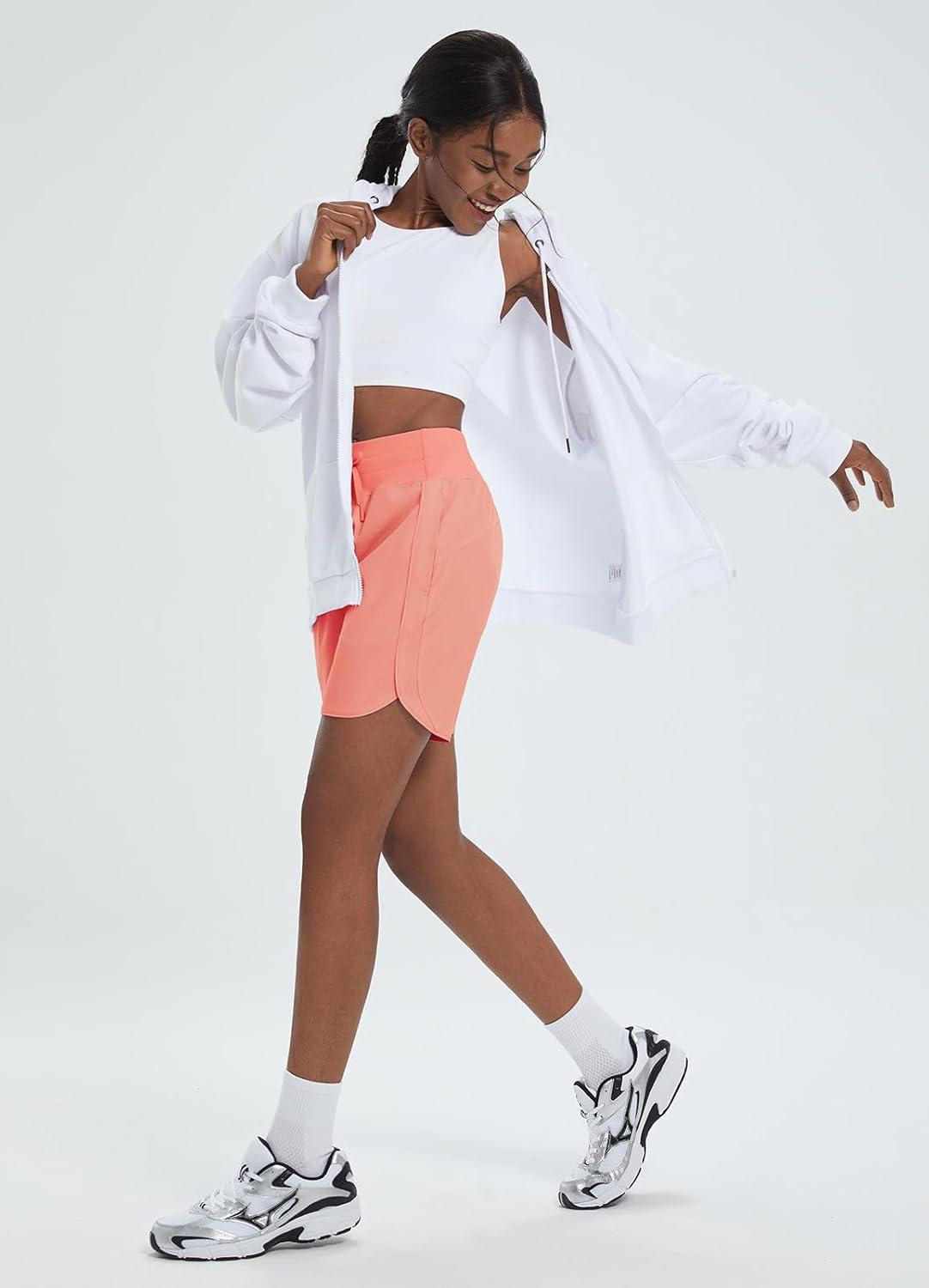 baleaf Women’s 7″ Athletic Long Running Shorts Workout Gym Quick Dry Hiking Shorts High Waisted Zipper Pocket(Coral)