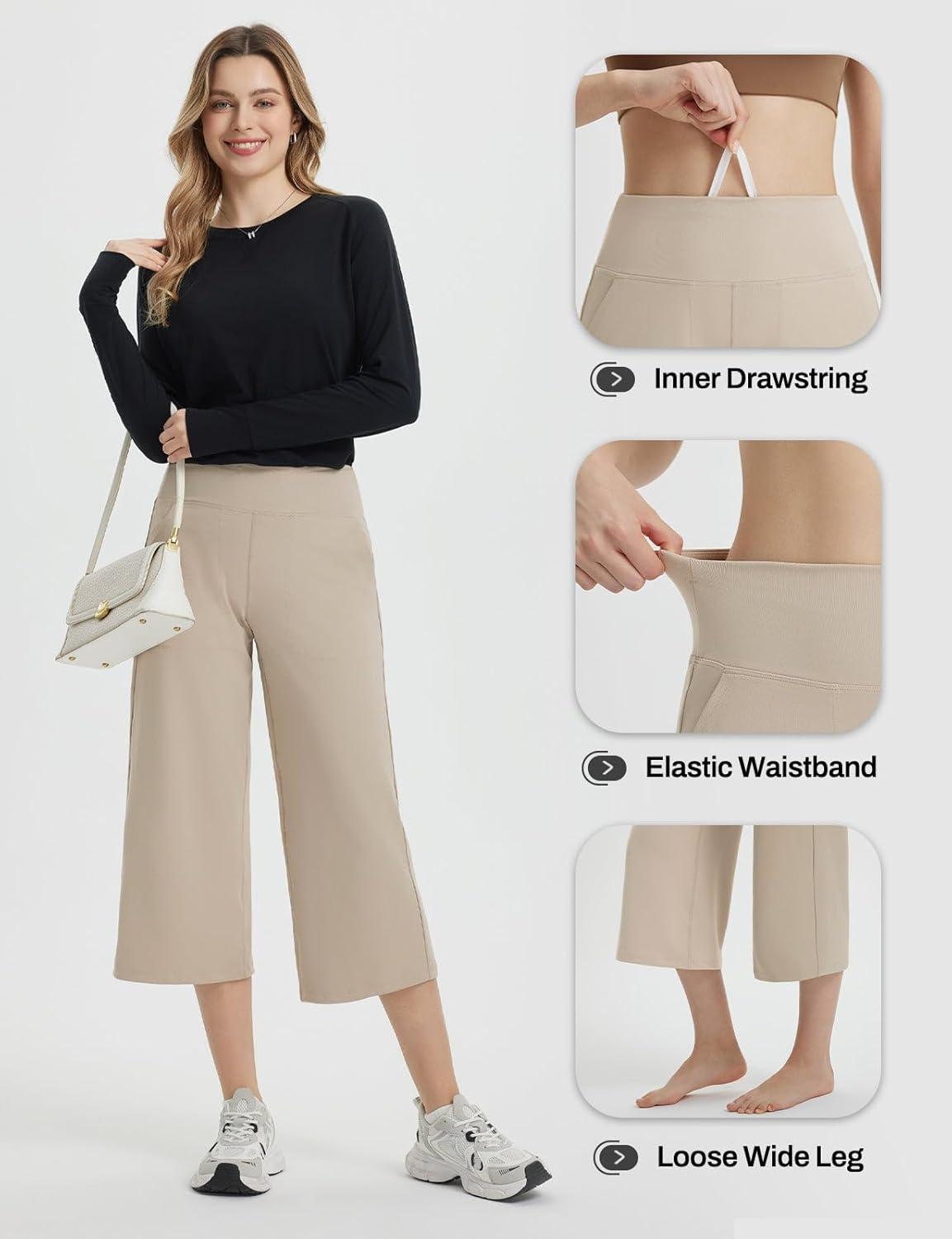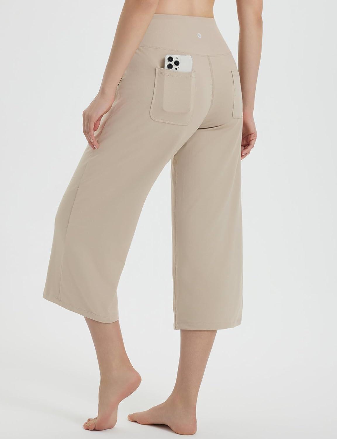 baleaf Women's Capri Pants Wide Leg Yoga Dress Capris High Waist Cropped Pants with Pockets Loose Lounge Travel Summer(Khaki)