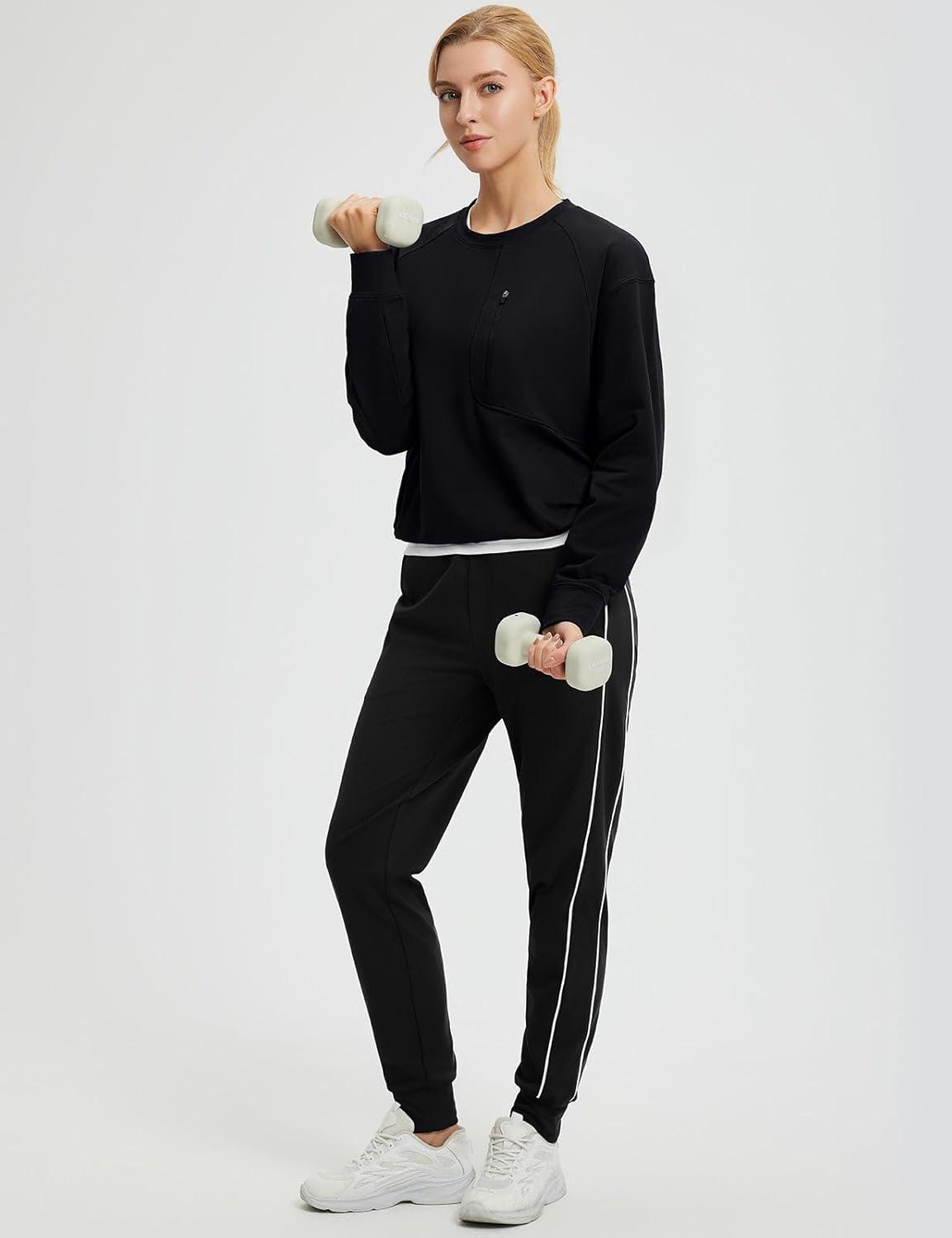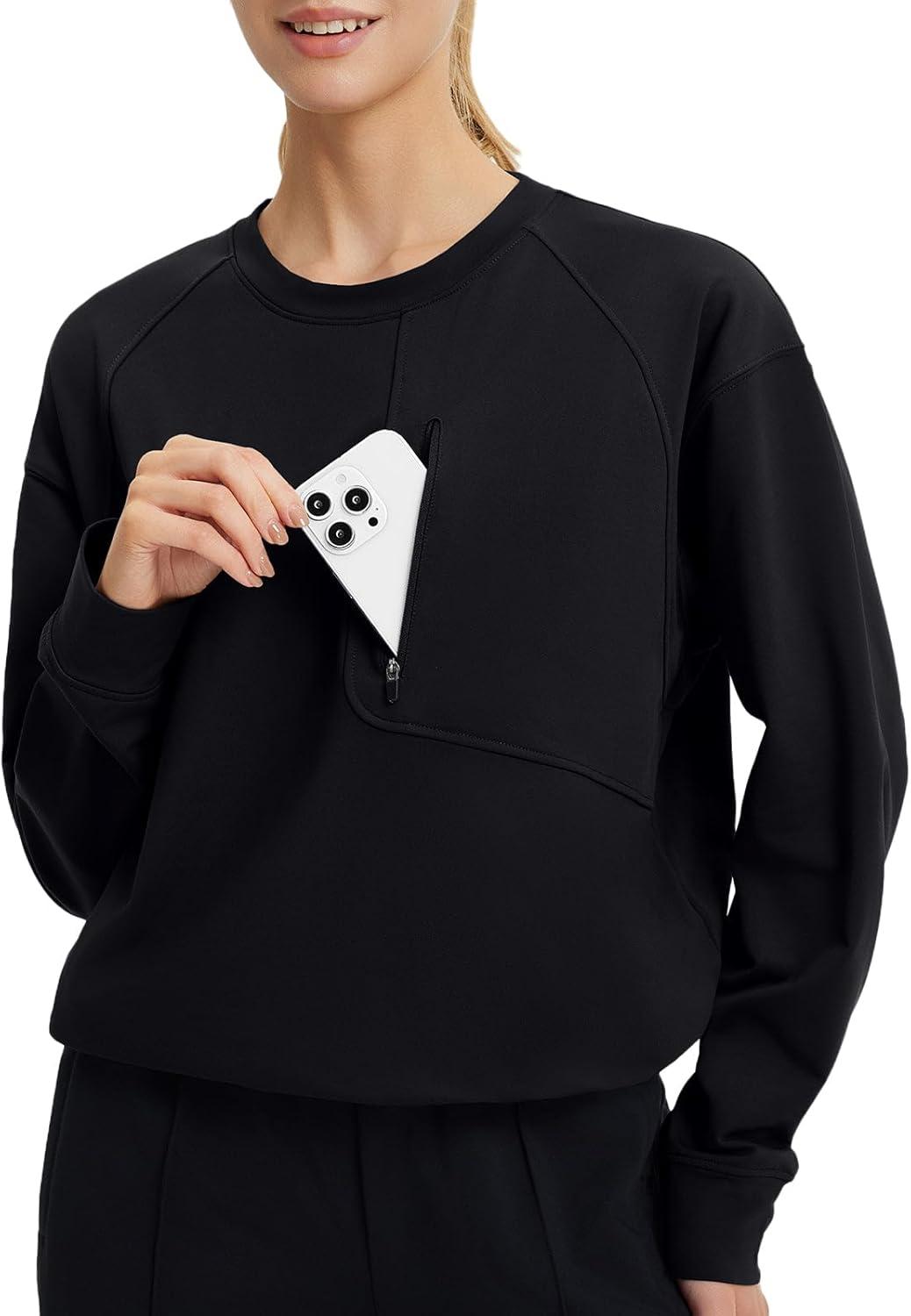 baleaf Women’s Cropped Crewneck Sweatshirt Fleece Lined Pullover Loose Fit Long Sleeve Workout Athletic Tops with Pocket(Black)