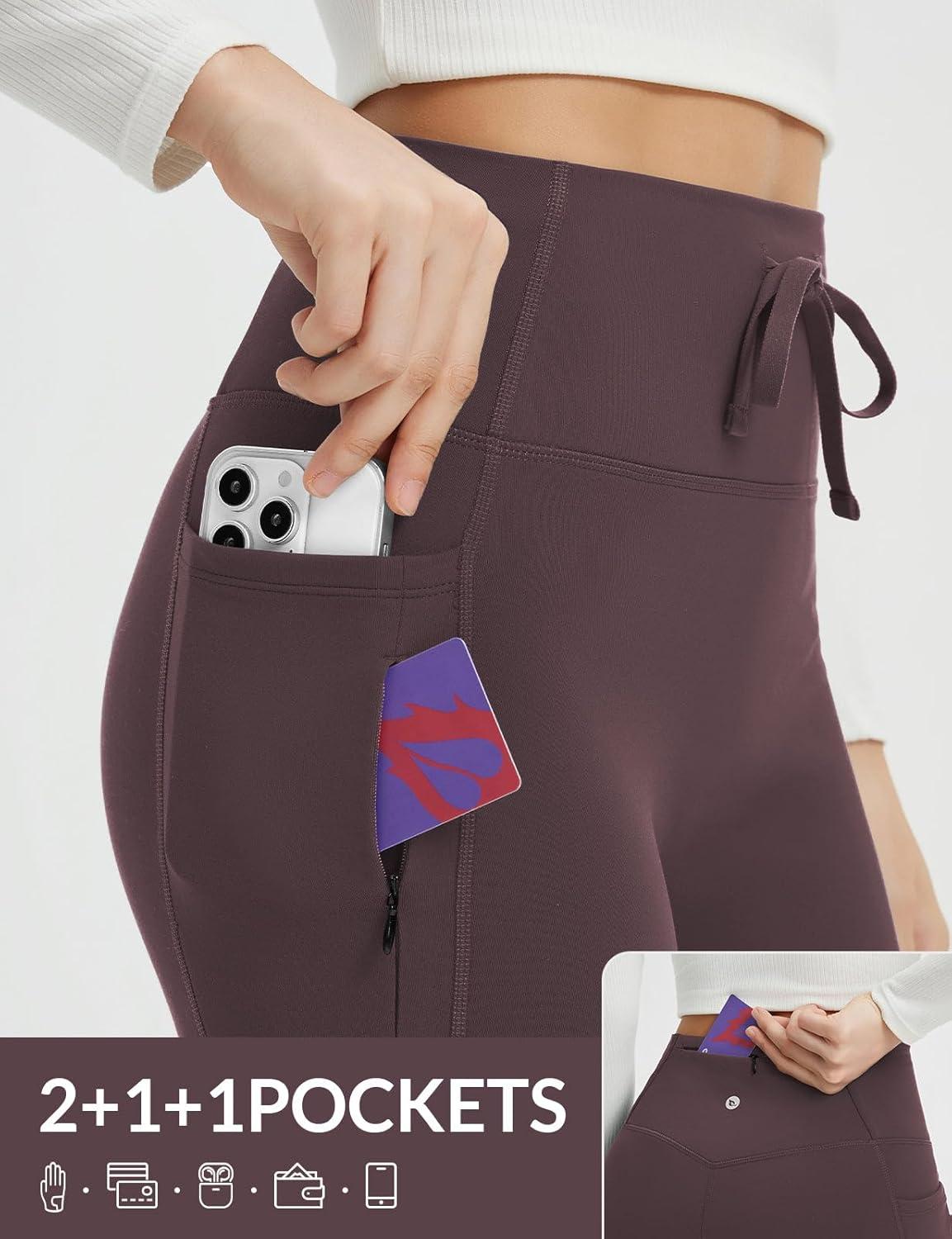 baleaf Women’s Fleece Lined Pants Winter Thermal Warm Hiking Yoga Pants with Zipper Pockets Bootcut High Waist Flare Leggings(Dark Brown)