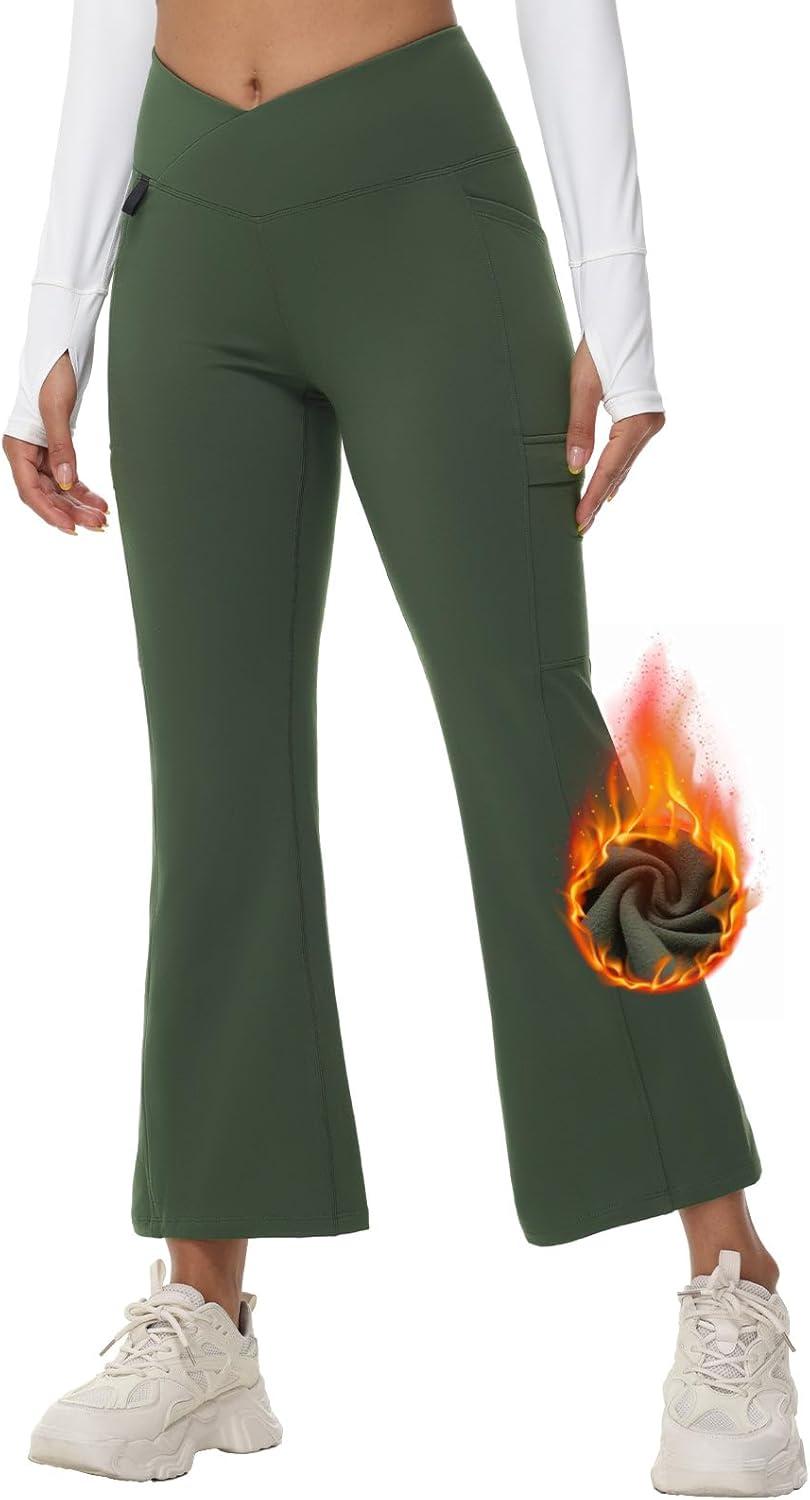 imagebaleaf Womens Fleece Lined Pants Winter Thermal Water Resistant Crossover Flare Leggings Warm Bootcut Hiking OutdoorDark Army Green