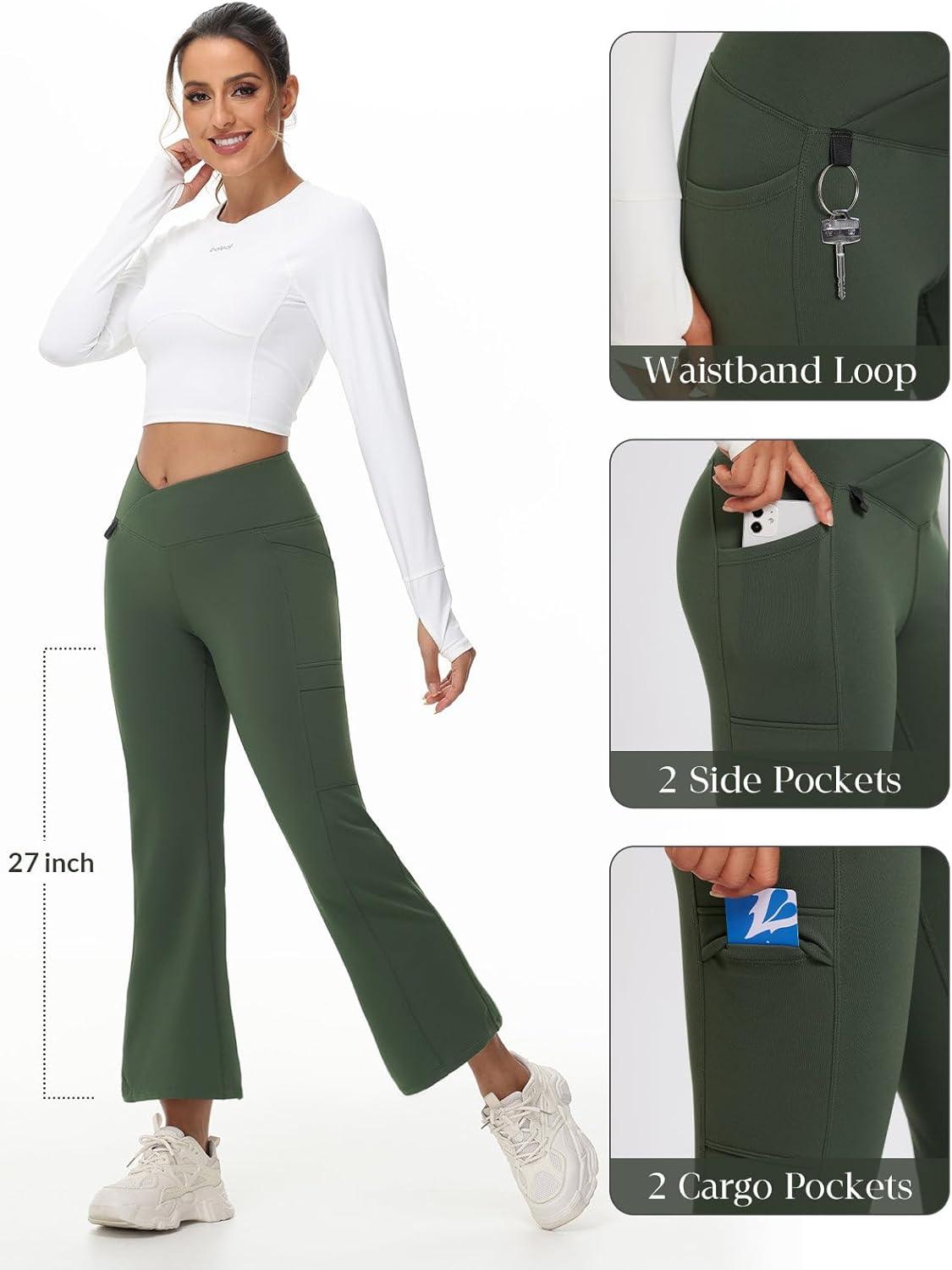 baleaf Women’s Fleece Lined Pants Winter Thermal Water Resistant Crossover Flare Leggings Warm Bootcut Hiking Outdoor(Army Green)