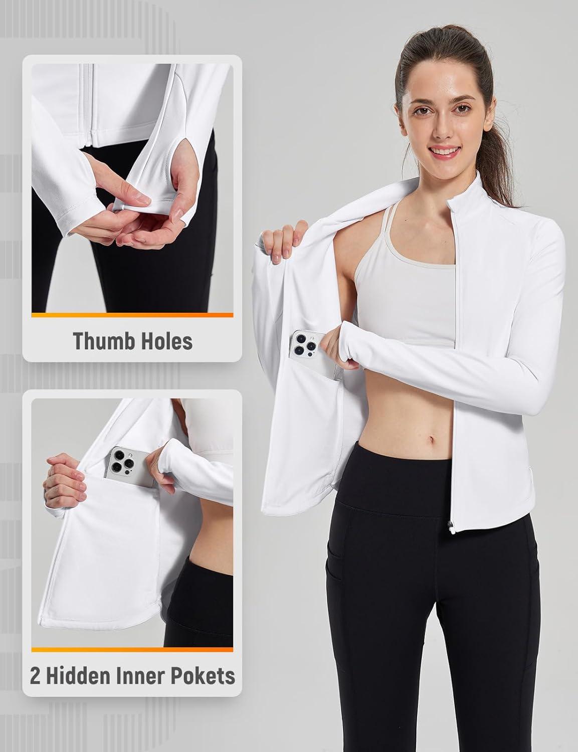 Thumb holes & Mesh Vents: This long sleeve track jacket also offers thumb holes to increase hand coverage and warmth during the cool weather. Hidden underarm mesh vents provide ventilation and prevent overheating
