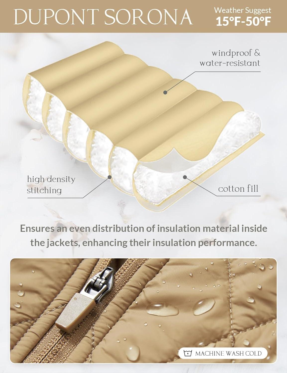 imagebaleaf Womens Golf Quilted Jackets Winter Lightweight Warm Stand Collar Water Resistant Puffer Jacket 4 PocketsBrown