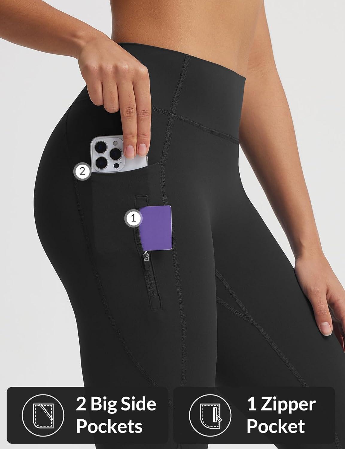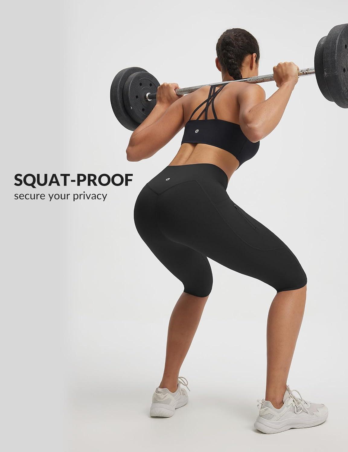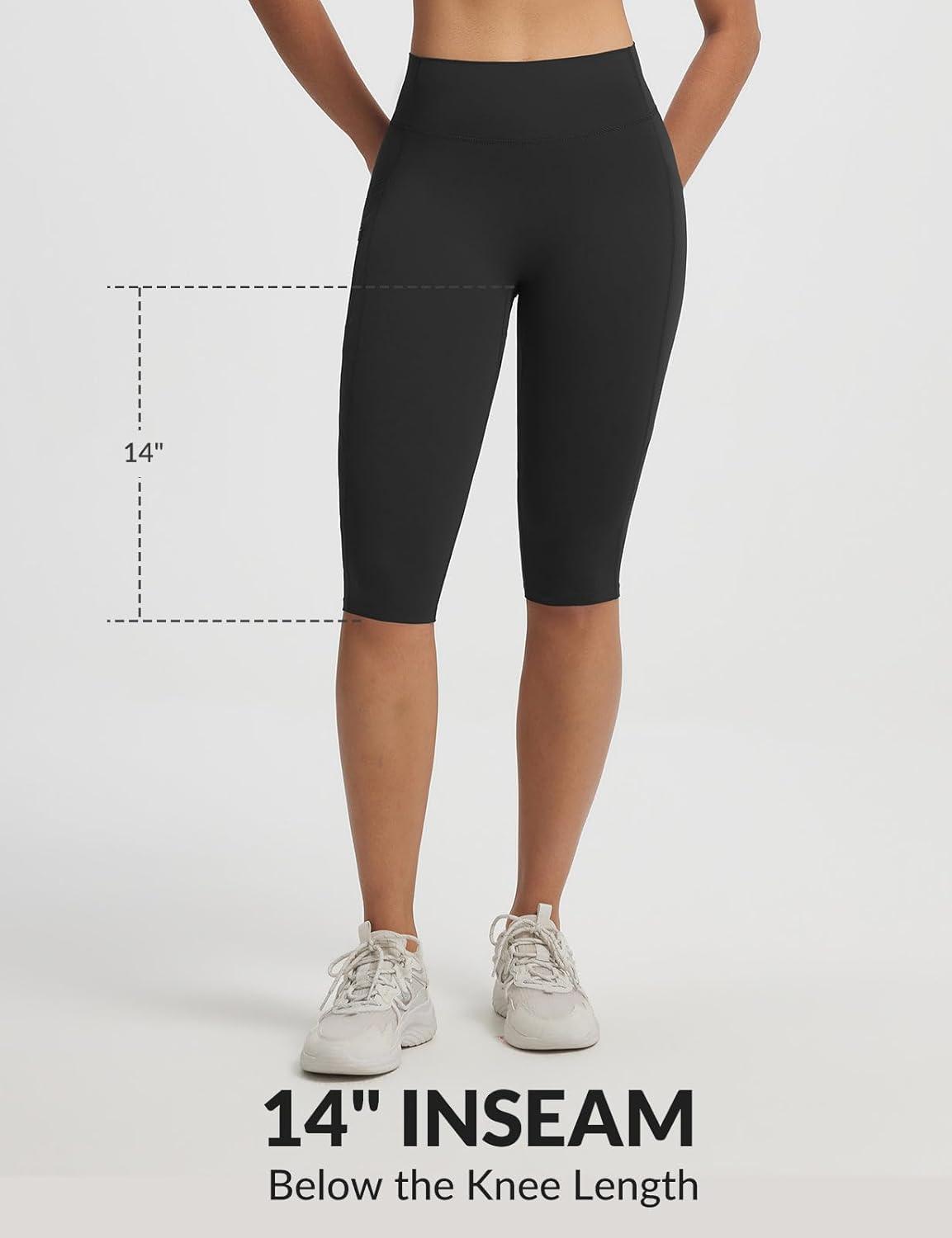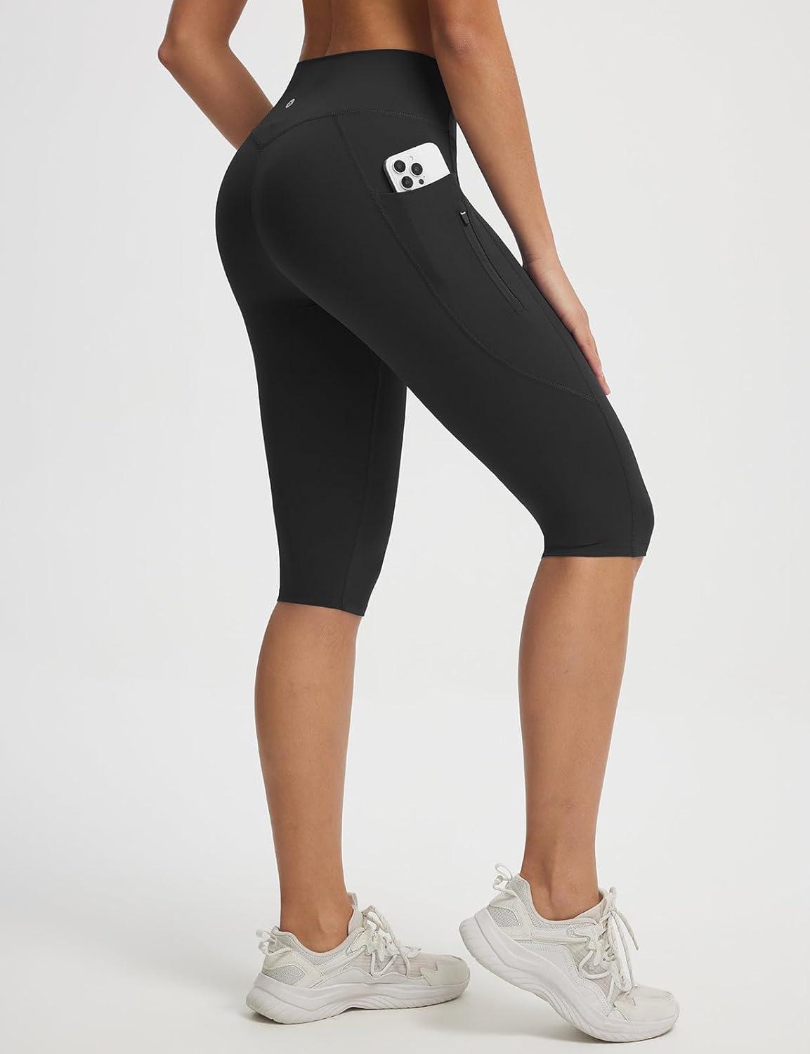 baleaf Womens Knee Length Capri Leggings with 3 Pockets Yoga Capri Pants High Waisted Summer Casual Wokrout(Black)