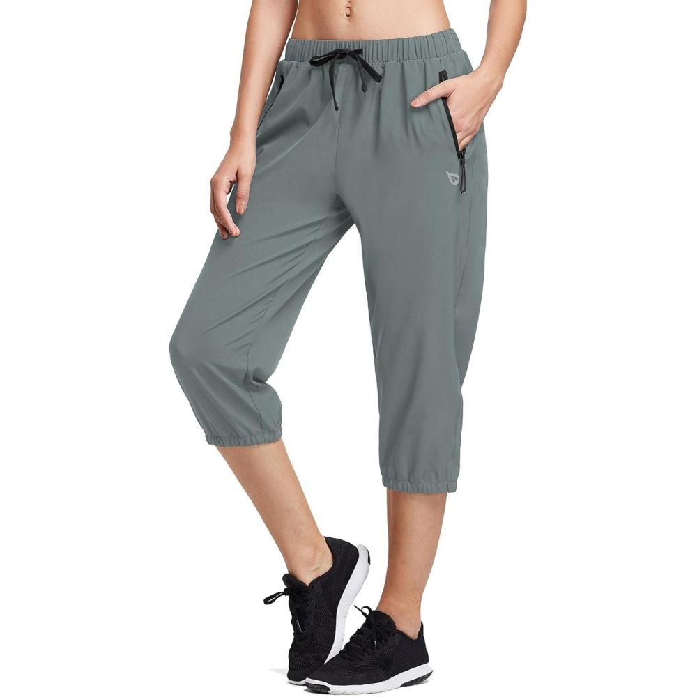baleaf Women’s Lightweight Capri Jogger Hiking Shorts Running Capri Pants Quick Dry UPF 50+ Zipper Pockets(Light Grey)