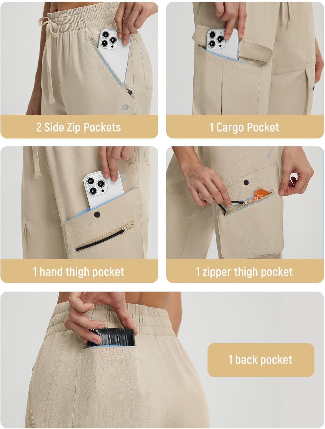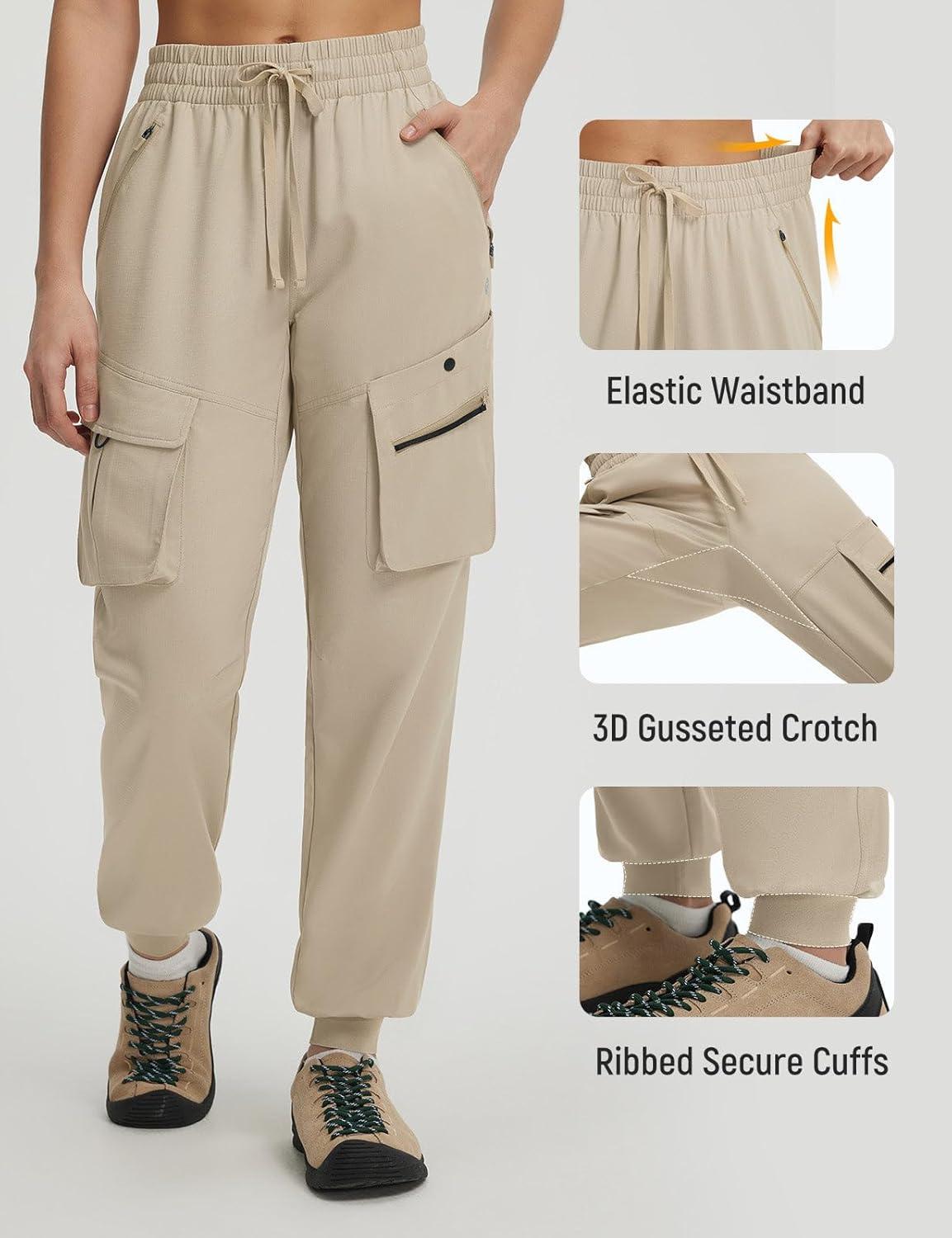 baleaf Women’s Ripstop Hiking Pants with 6 Pockets Water Resistant Joggers Lightweight Quick Dry Elastic Waist Travel Pants(Khaki)