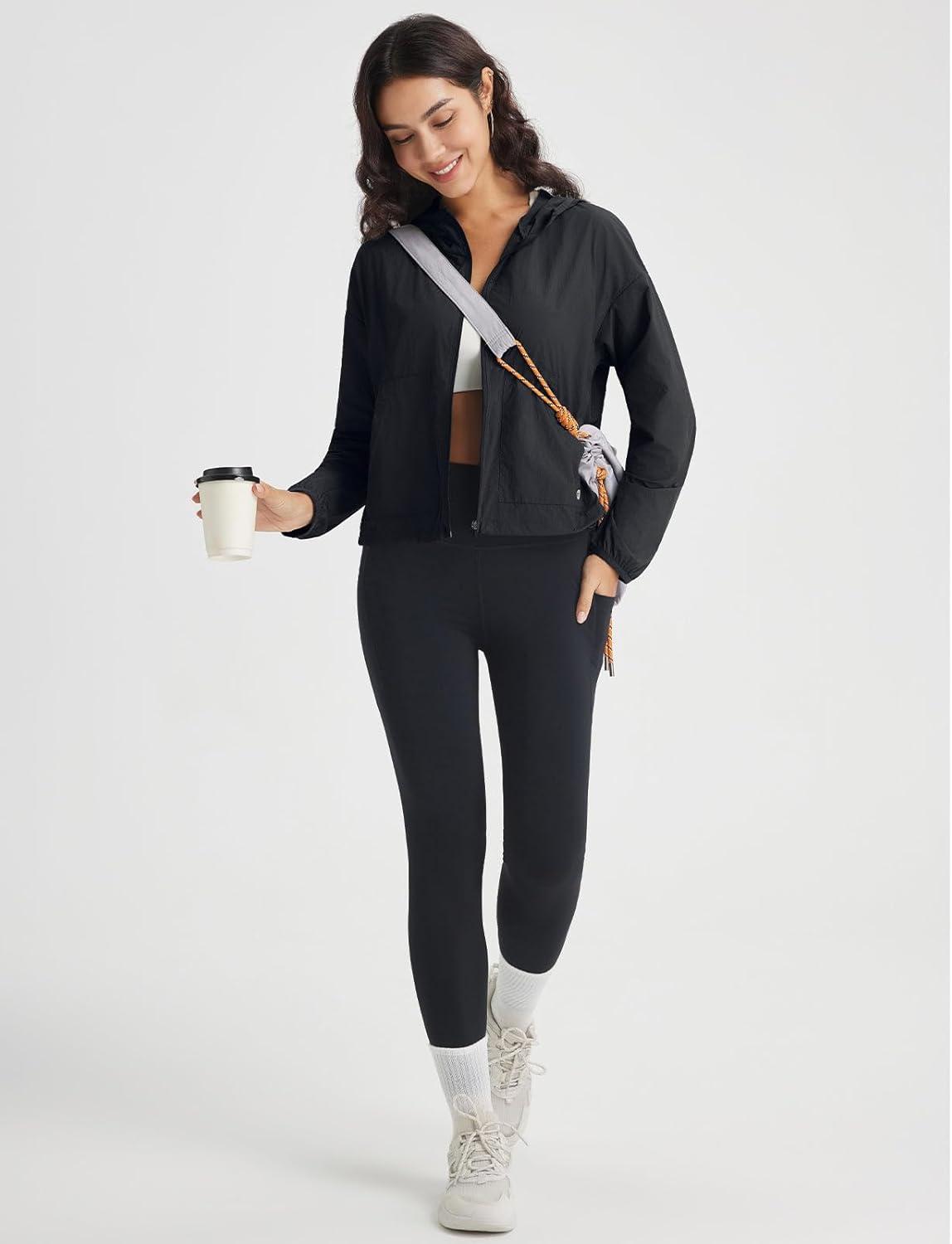 baleaf Women's Sun Jackets Lightweight Packable Long Sleeve Hoodie Zip Up UPF 50+ Crop Shirts Water Resistant Tops Workout(Black)