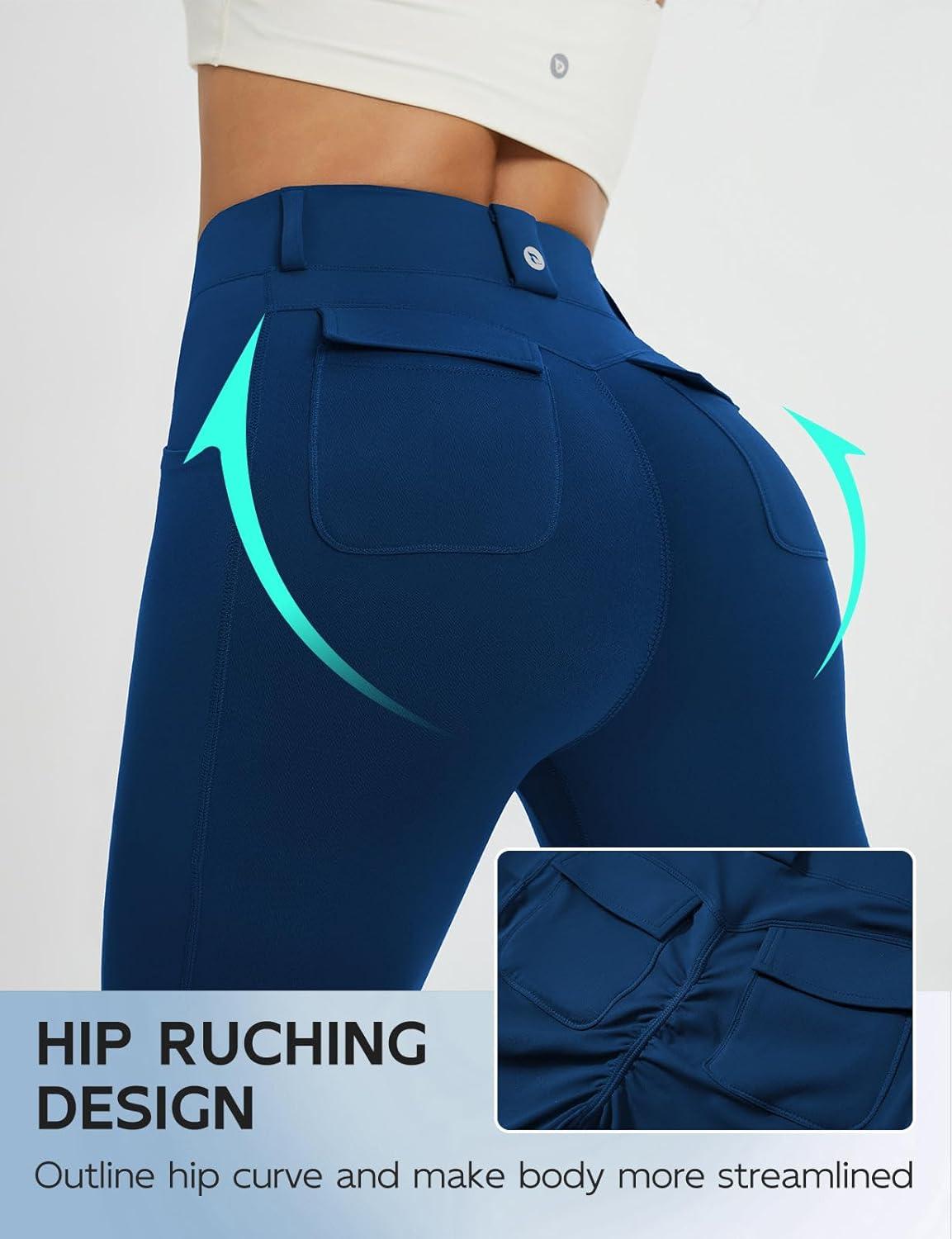 baleaf Women's Yoga Pants with 4 Cargo Pockets Scrunch Workout Flare Leggings High Waist Casual Gym Bell Bottom(Navy Blue)